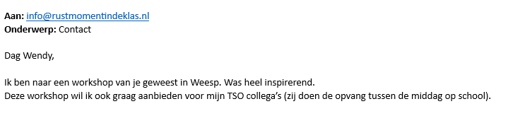 Mijn naam is Wendy de Groot in 2012 begon met Rustmoment in de klas.nl. Een online platform welke nog steeds dagelijks wordt ingezet in klassen in NL en BE. Al snel ontstond de vraag naar scholing. Regelmatig geef ik workshop op scholen, bij studiedagen of spreek ik op congressen.
